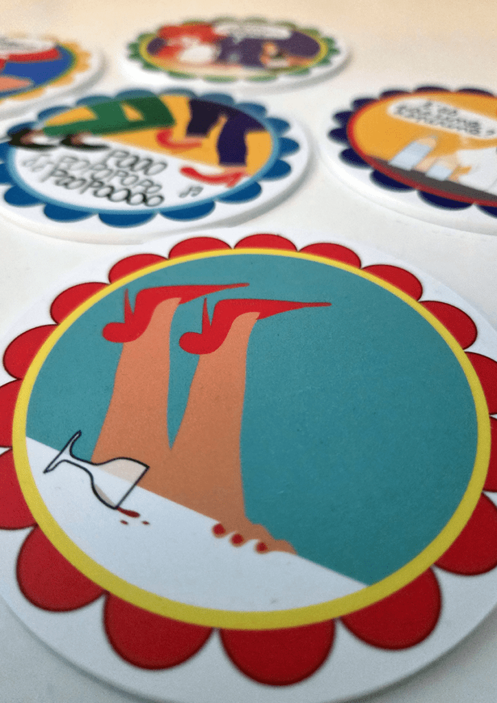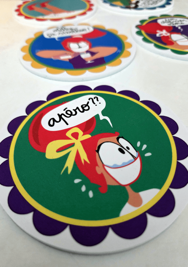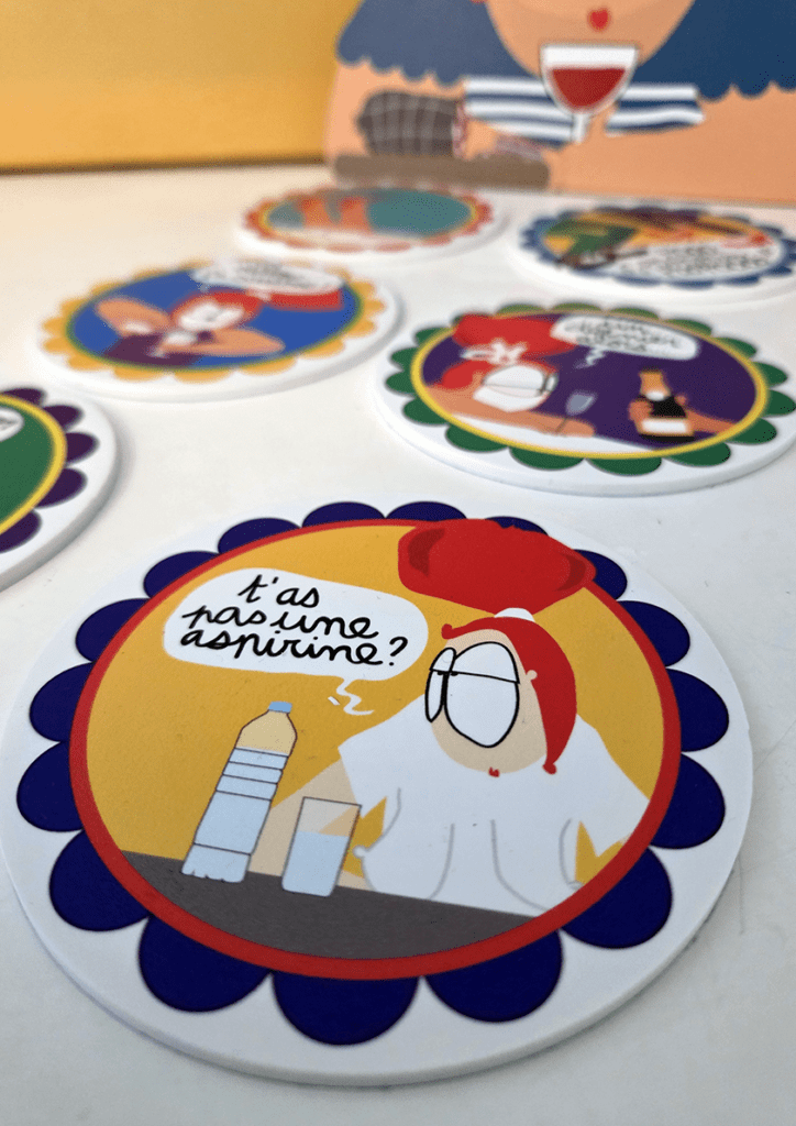 Chaque sous-verre présente un dessin humoristique différent, inspiré des moments clés pendant un apéritif : les prétextes à reprendre une gorgée, les danses improvisées ou encore le fameux “un dernier verre, alors…”