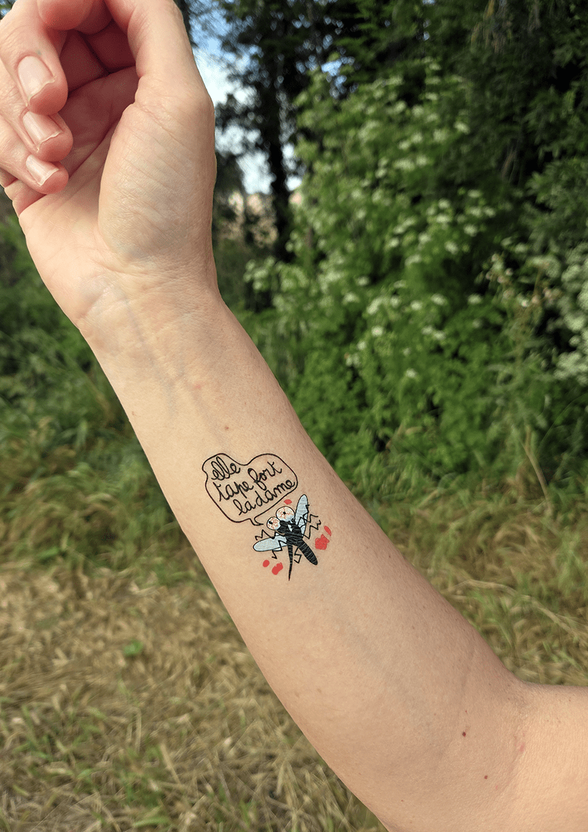 A savoir : Ces tattoos éphémères sont conformes aux normes cosmétiques françaises. À ce titre, ils ne contiennent pas d’agents allergènes. Les encres sont fabriquées à partir de soja. Toutefois, le seul élément au contact de votre peau est l’adhésif permettant de les faire tenir; celui-ci est constitué de polymère d’acrylate (Acrylate copolymer), l’agent liant le plus couramment utilisé dans les produits cosmétiques, mais aussi les gels douches et shampoings. Il ne présente aucun danger pour votre peau. Vous pouvez obtenir plus de renseignements sur ce produit sur l’Observatoire des cosmétiques.