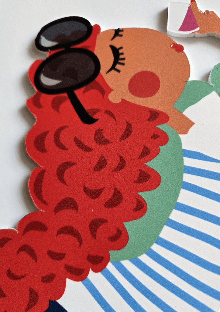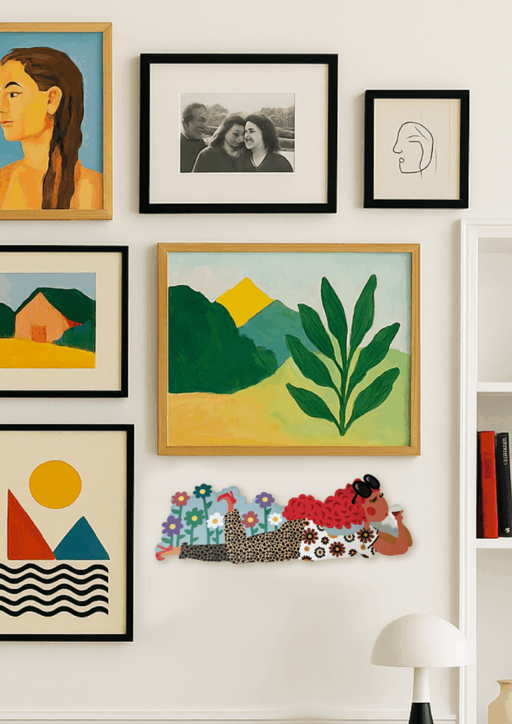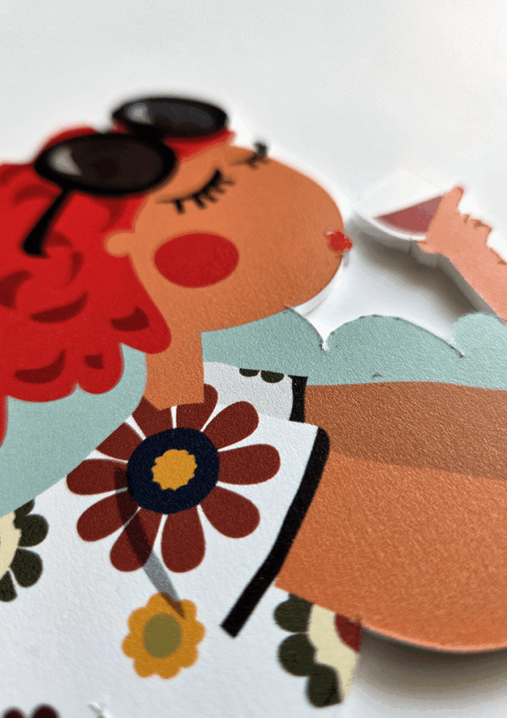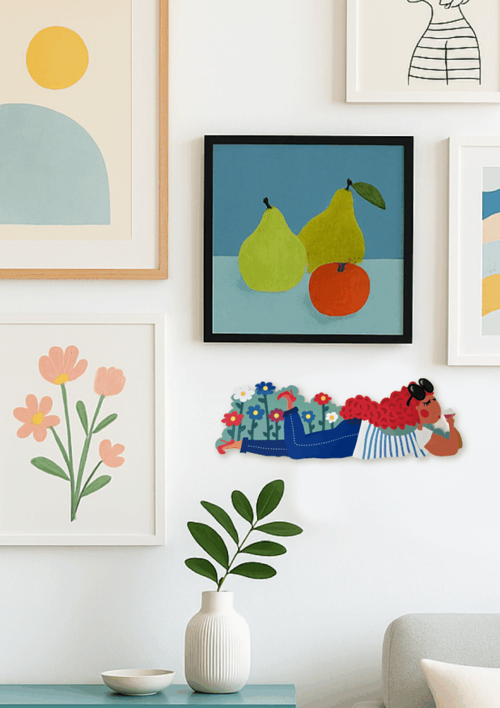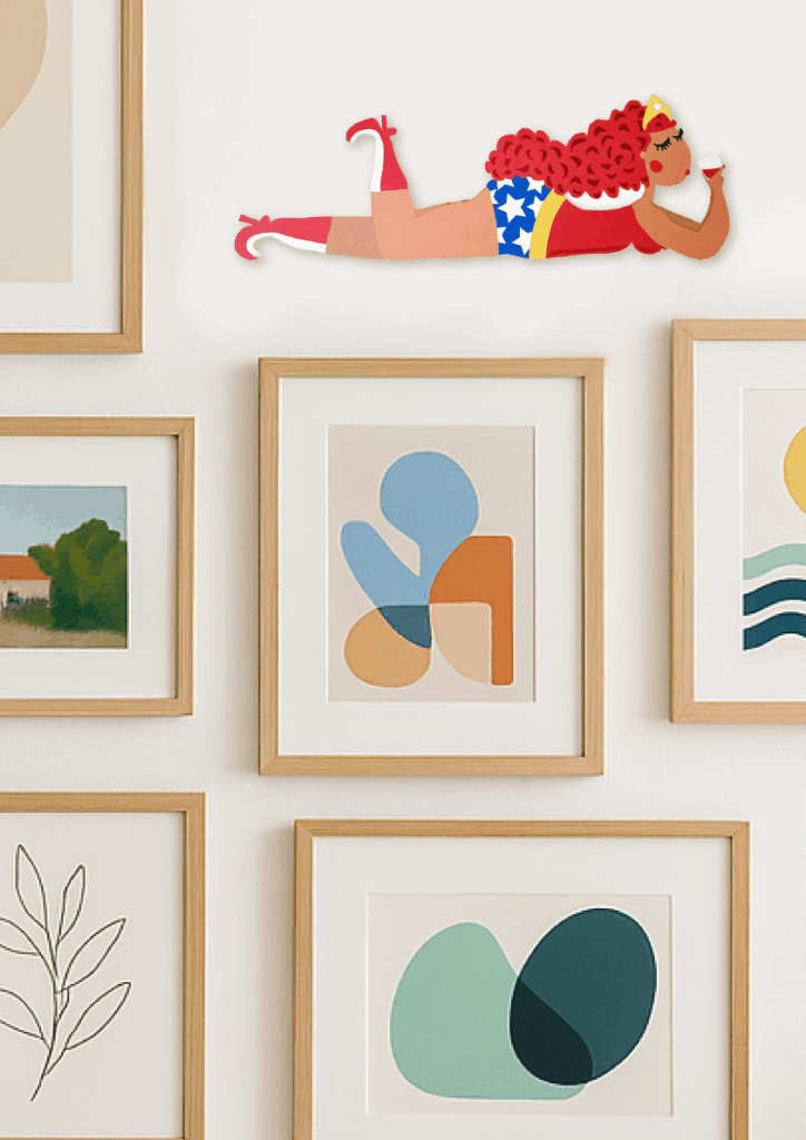 Elle s’est installée dans un jardin foisonnant, verre à la main et look félin assumé. Un concentré de légèreté et d’autodérision, parfait pour égayer un salon ou un bureau.